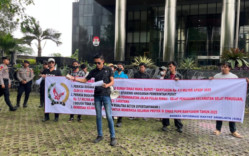 Lensa-informasi.com, Jakarta, – Selasa, 27 Januari 2026, Suara Informasi Rakyat Sriwijaya (SIRA) mendatangi gedung merah putih KPK RI untuk melakukan aksi damai dengan bertujuan menyampaikan dukungan kepada lembaga anti rasuah ini segera turun ke Kabupaten Banyuasin Prov. Sumsel, bahwa banyak permasalahan pelaksanaan pekerjaan proyek-proyek khususnya pada Dinas PUPR Kab. Banyuasin TA. 2025 yang diduga kuat bermasalah dan berpotensi merugikan keuangan Negara.